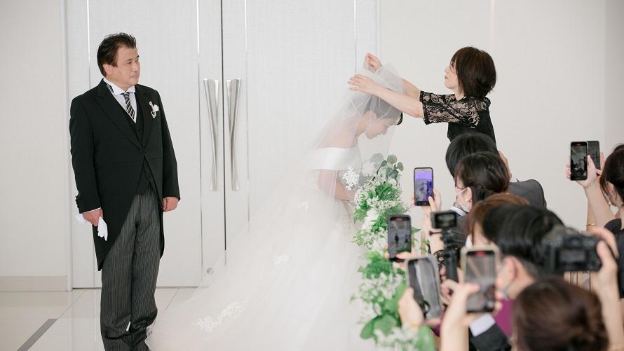 当日バージンロードを歩く前に母にベールダウンをしてもらったのですが、母に身支度をしてもらうことなんて小さい頃に戻ったみたいだな~と思った瞬間、今まで与えてもらった愛情が一気に蘇り、感じたことのないあたたかい感情と感謝の想いでいっぱいになりました。また、父と腕を組んだ時は少し恥ずかしかったですが、私を受け渡す際、新郎と握手をした時の父の顔が昔と変わらない優しい笑顔で、久しぶりにこんな近くで笑った顔を見たなぁと涙が出ました。