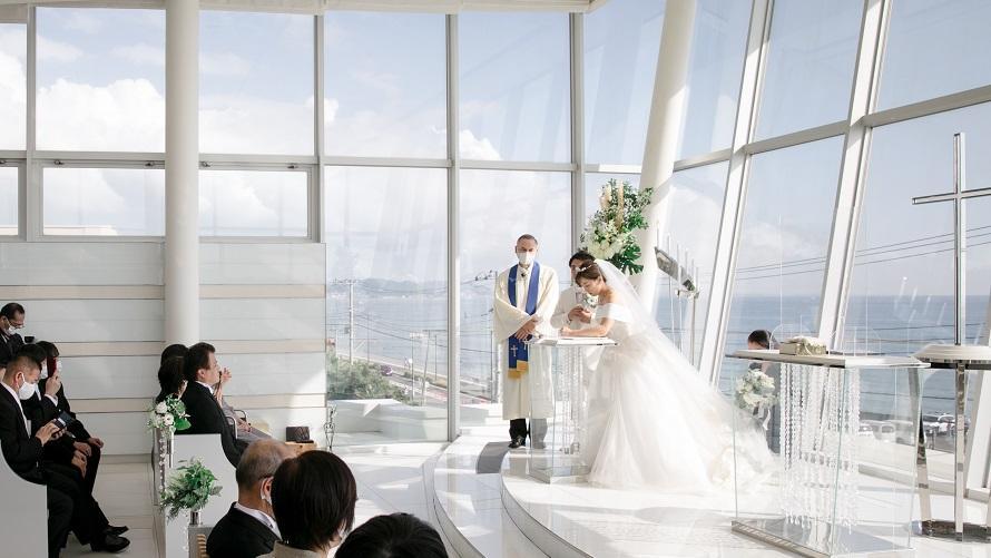 一度見学させていただいた時、目の前に広がる海の青さと、真っ白で美しいチャペルに感動し、チャペル挙式を選びました。まるで船の上にいるかのようで、家族や友達と新しい旅に出ていくような気分になりました。