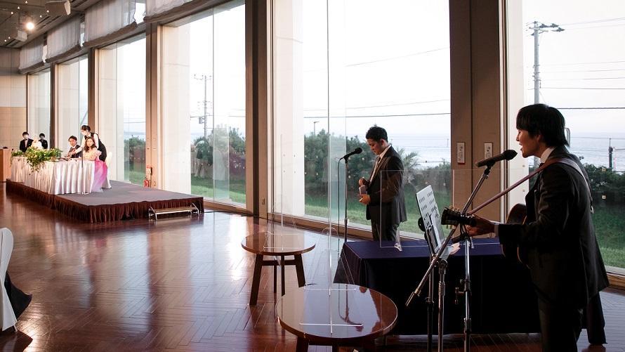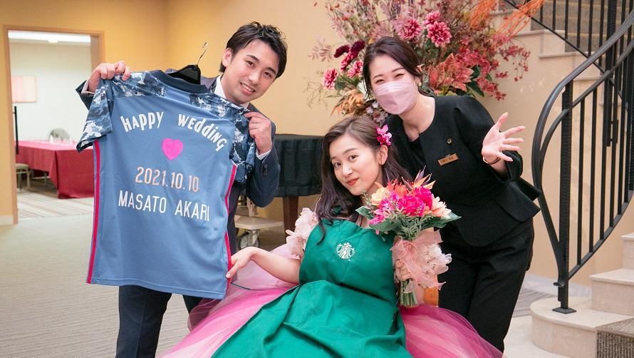 音楽はハワイアンソングをかけてもらったり、2人ともサッカーが好きなのでJリーグの曲や海外サッカーで使われている曲も選びました。違う曲でも、何となく音楽が似ているものを選び、全体的にまとまりがあるように仕上げました。食事もどなたでも楽しめるようにあえて和風テイストのフルコースを選びました。