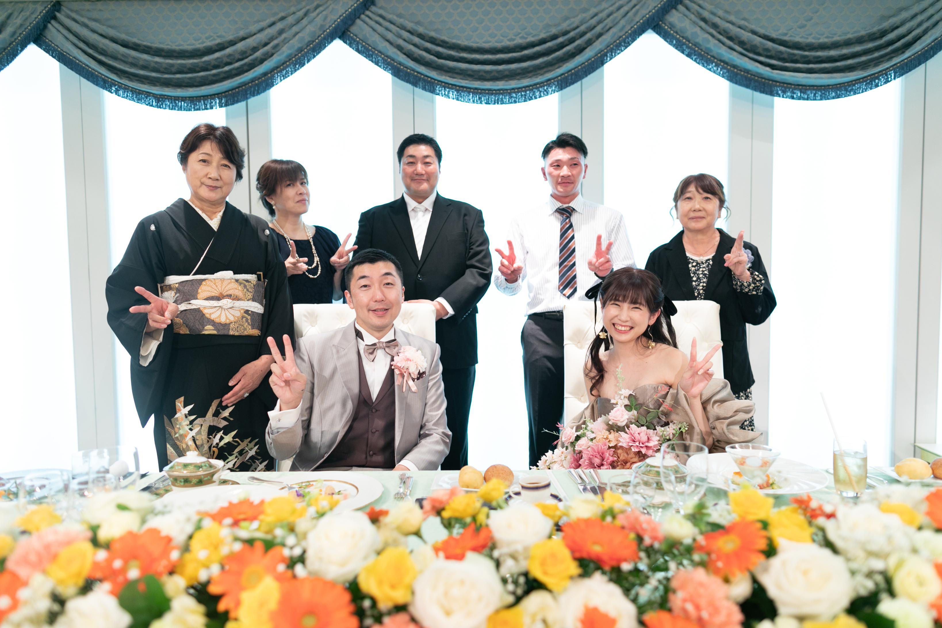 当日の披露宴ではメインテーブルにたくさんのゲストが集まり、集合写真撮影を行いました。