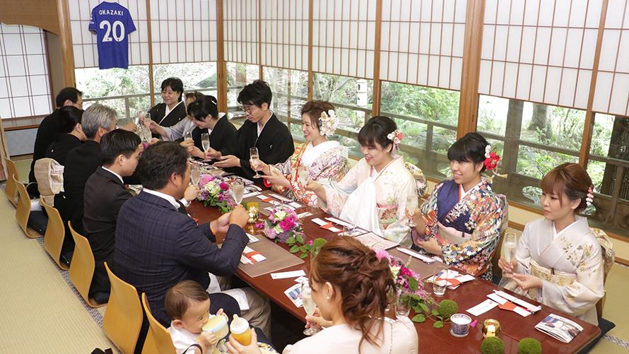 茶寮にてお食事会をしました。家族だけのアットホームなスタイルだったので、掘りごたつで距離も近く、みんなが心落ち着く空間になったかと思います。