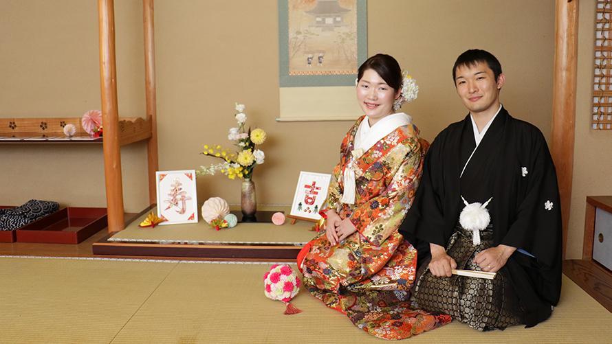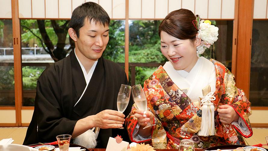 披露宴は行わず、少人数での食事会を茶寮で行いました。白無垢で神前式をした後、色打掛へとお色直しをしました。会席料理にしました。大人数ではなく、掘りごたつでしっかり料理もいただけました。堅苦しくならないよう、簡単なフォトブックを用意したり、ペーパーアイテムを作成しました。