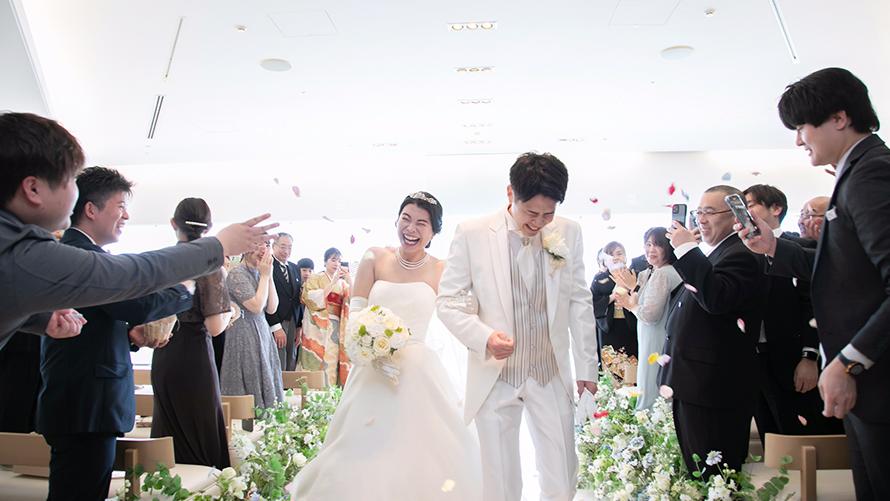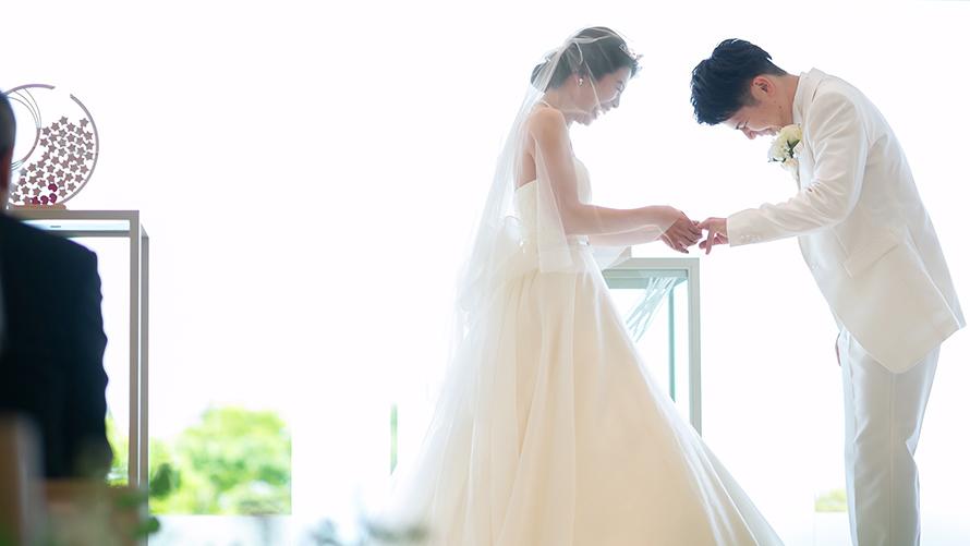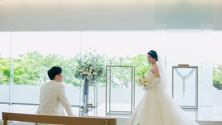 挙式会場の内装はもちろんキレイでしたが、カーテンが開くと二人の後ろにびわ湖や自然が見渡せることがとても良かったです。