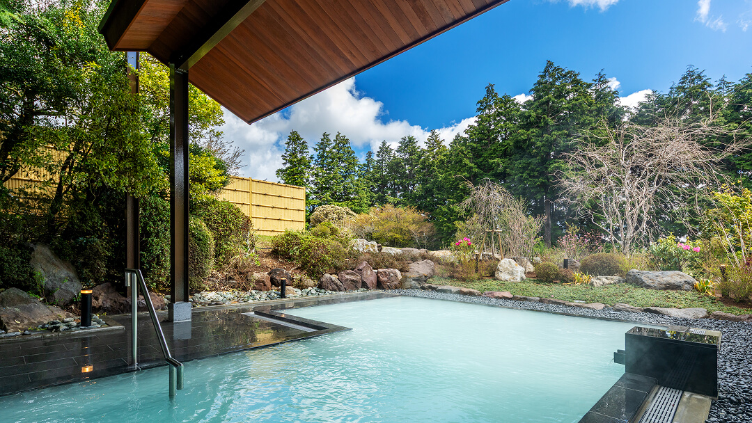 夜更けの静かな時間に浸かる露天風呂はここならではの神秘的な体験。箱根十七湯の中で最も高い位置から、満天の星を楽しめます。乳白色のにごり湯は、箱根でも希少とされ湯冷めしにくく“美肌の湯”としても評判です。露天風呂を満喫した後は心地よい夜風が火照った体を癒やしてくれる湯上り散歩へ。自然に囲まれた中庭でマイナスイオンを浴びて、心身ともにリフレッシュ。