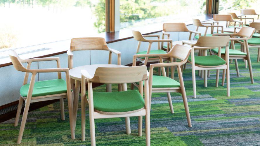 ラウンジの椅子・テーブルはマルニ木工 HIROSHIMAを使用しています。ナチュラルな木肌を生かし、シーンにこだわらず、あらゆる場所でずっと長く使えることを想定したシンプルで精緻な構造の椅子とテーブル。何より背からアームにかけての緩やかなカーブが美しい。優しい手触りと木の温もりを感じるHIROSHIMAにぜひ触れてみてください。