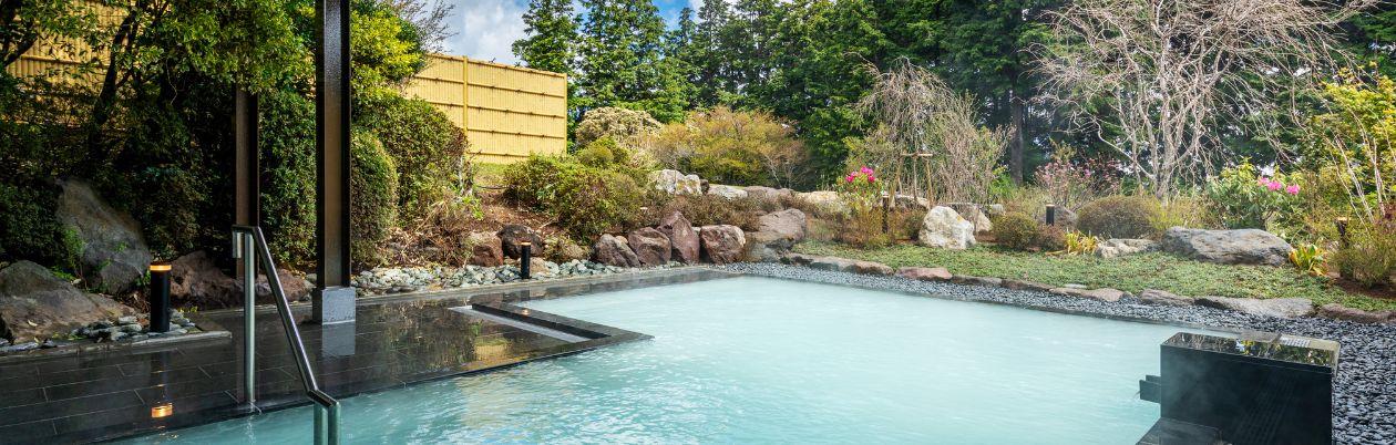 湯ノ花沢温泉は、駒ヶ岳東斜面の海抜約950m地点、箱根十七湯の中では最も高い位置にあります。箱根でも希少な乳白色のにごり湯は発汗作用があり、湯冷めしにくく美肌の湯として評判です。箱根で最も天空に近い乳白色の温泉露天風呂からは、ここからだけの満天の星をご満喫いただけます。