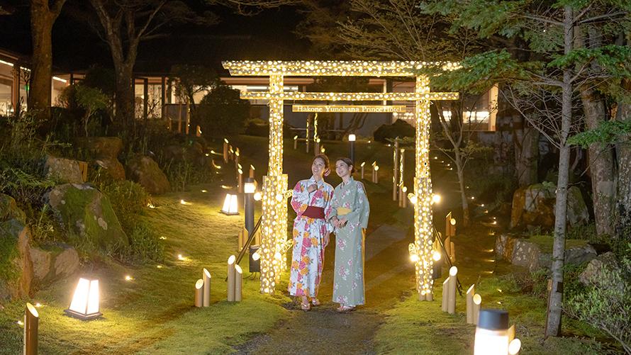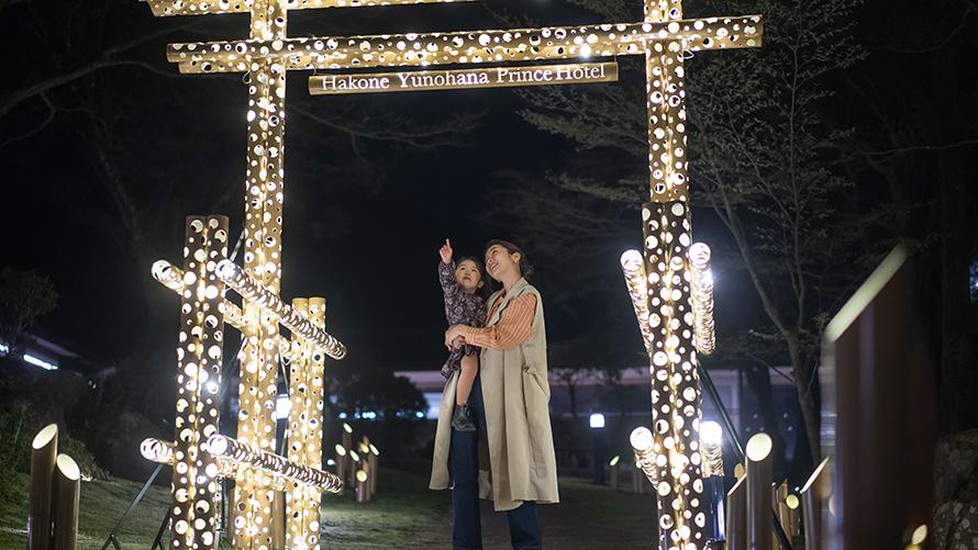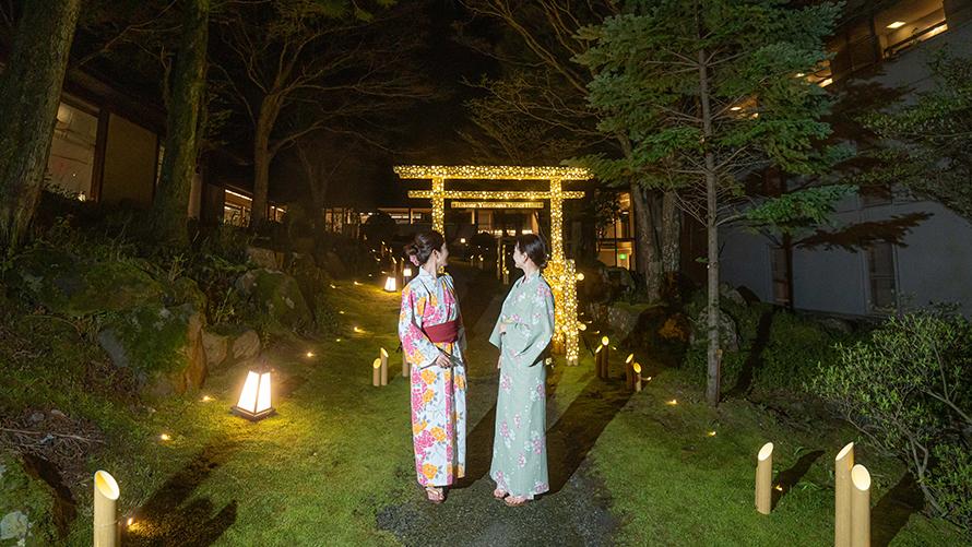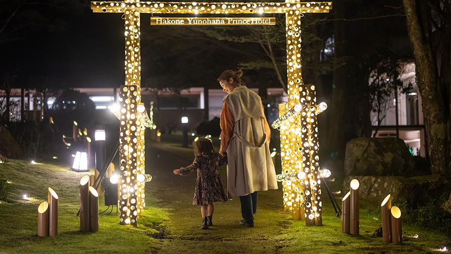 箱根湯の花プリンスホテルは、宿泊施設において箱根一の標高(935m)を誇る大自然に囲まれた秘境宿です。自然豊かな山々に囲まれたホテル中庭では、春は桜、夏は新緑、秋は紅葉、冬は雪景色の絶景をご覧いただけます。当ホテルを象徴する絶景の中庭をさらに引き立たせる取り組みとして、“竹あかり”総合プロデュース集団CHIKAKENによる「竹あかり」ライトアップを実施いたします。山に宿る神とされている「山の神」に感謝する想いをテーマにした演出「~竹あかり煌めく~山神の小径」で、自然を感じながら自然に感謝する癒し体験をしてみてはいかがでしょうか。