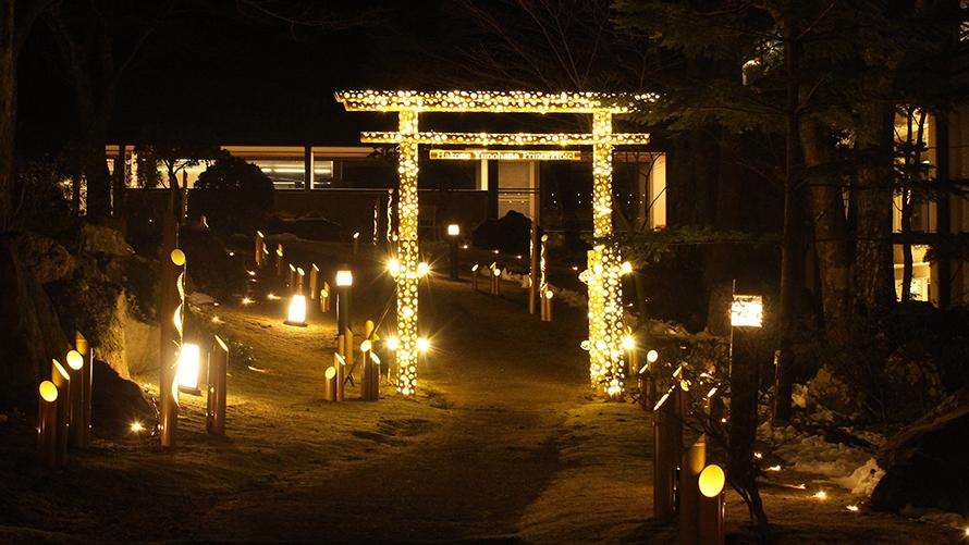 ホテルの西側に聳える標高1,356m「駒ヶ岳」は神が宿る山「神山」を崇め、古代山岳信仰の聖地であったといわれています。今も駒ヶ岳山頂には、「馬降石(ばこうせき)」や「馬乗石(ばじょうせき)」など歴史を感じる岩や石が置かれています。当ホテルは、地熱蒸気や沢水など山の恩恵を受けています。今日において、事業活動を行えているのは山に宿る神「山神(やまがみ)」のおかげであり、感謝する想いを込めて鳥居の竹あかりを設置いたしました。