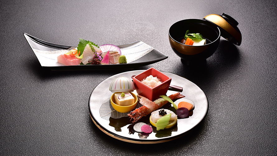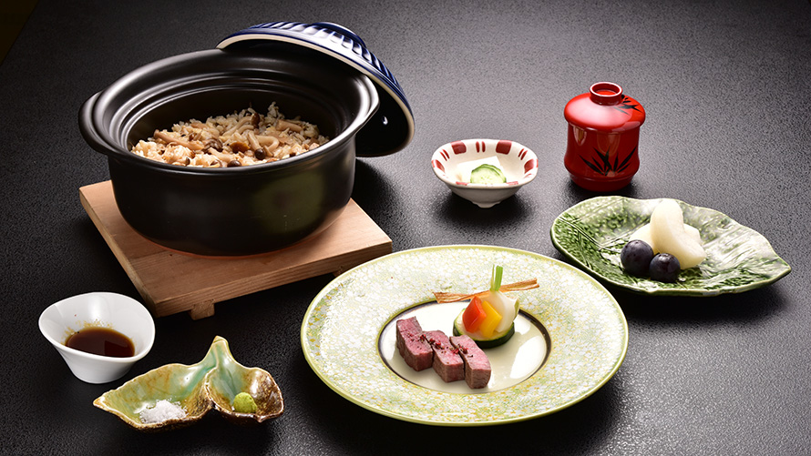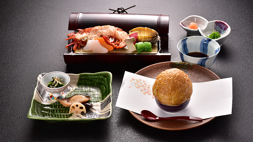 蒸物の「湯けむり蒸(せい)篭(ろ)」は、伊勢海老や蝦夷鮑などの食材をお客さまの目の前で蒸しあげます。竹あかりからヒントを得た料理長おすすめの創作料理をぜひご堪能ください。