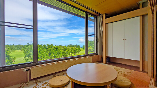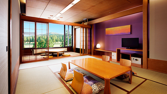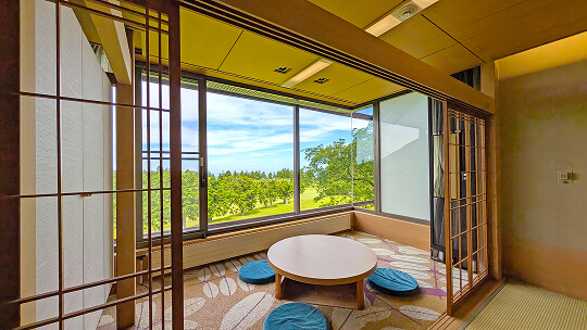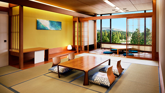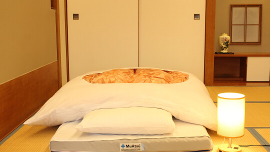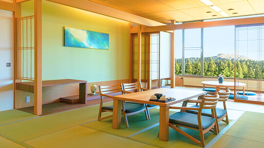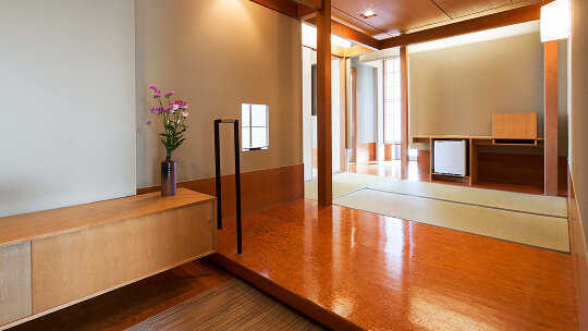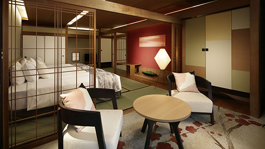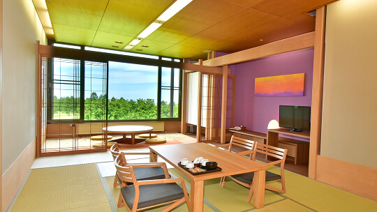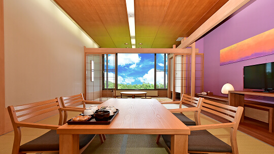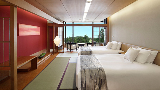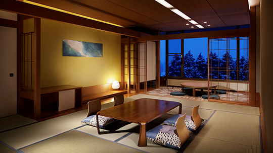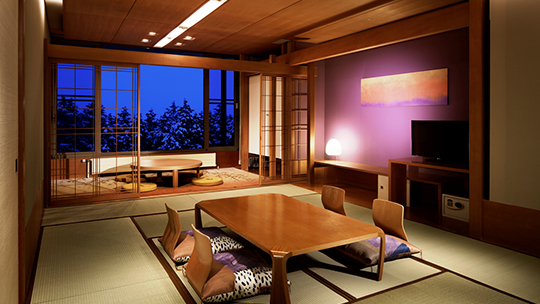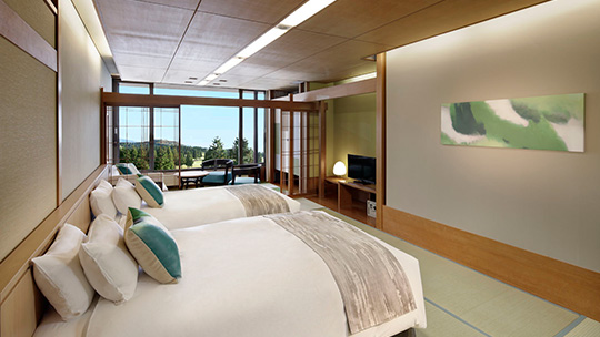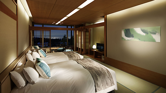 ベッド2台とトランドルベッド1台を設置した最上階の和室ツインルーム。最大3名さまでご利用いただけます。都心部の煌びやかな夜景、水平線から昇る朝日で絶景体験を。