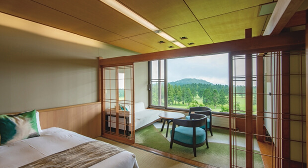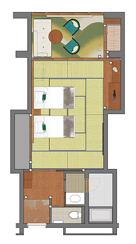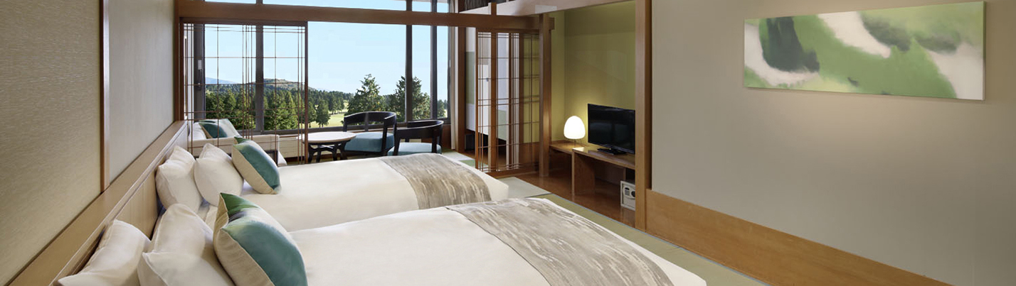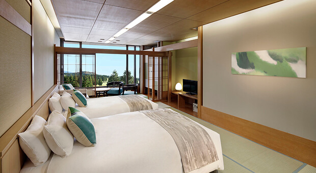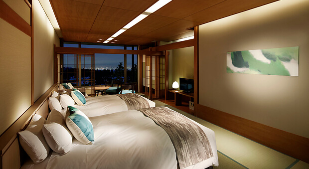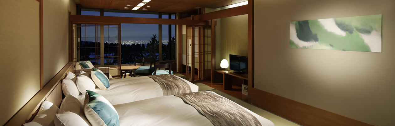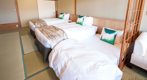 ベッド2台とトランドルベッド1台を設置した最上階の和室ツインルーム。最大3名さまでご利用いただけます。都心部の煌びやかな夜景、水平線から昇る朝日で絶景体験を。